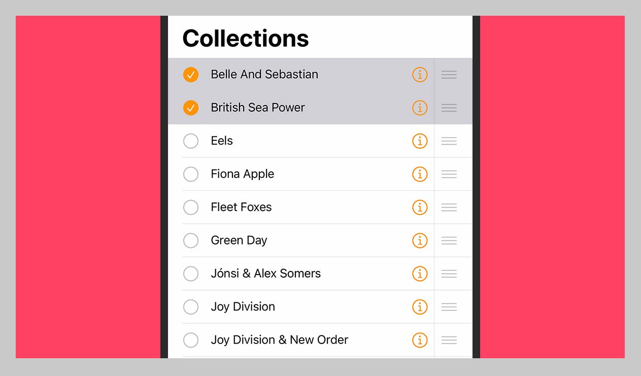 The app works with anything inside the default Music app, whether that’s synced from the Apple Music streaming catalog or imported from elsewhere. When you first open up the app, you’ll see all your music organized by artist name, and from there you can start reordering the lists and moving albums between groupings that you’ve created yourself.