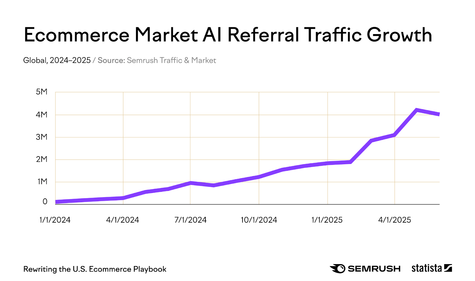 The report reveals the most dramatic change in online retail is how Americans find products. Monthly visits to shopping websites from AI assistants increased by a staggering 3,900% – from around 100,000 visits in January 2024 to over 4 million by June 2025.