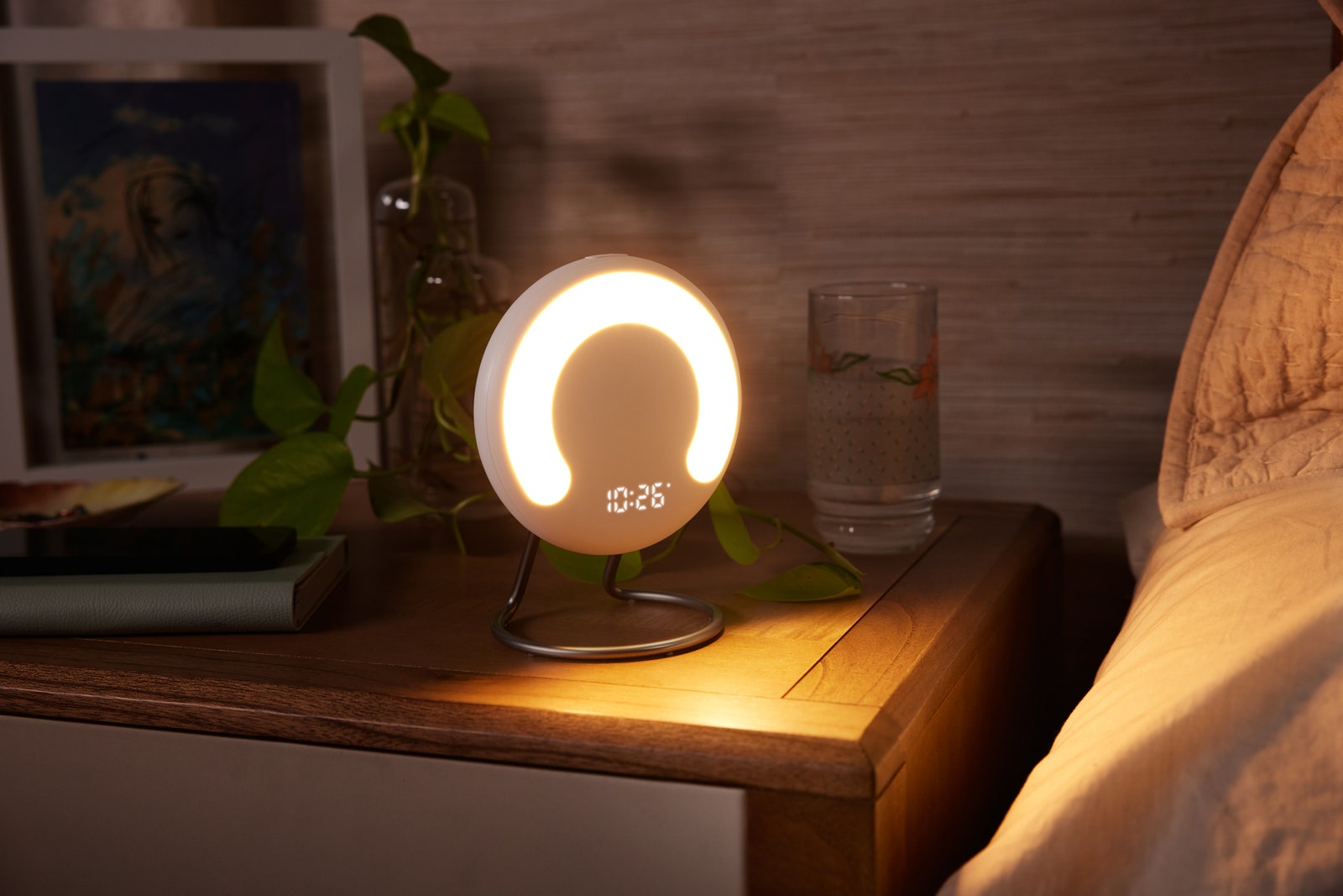 It’s a sleep tracker first, but it’s also a nice bedside lamp. With just a small arc of actual light, it gets really bright or really dim, depending on what you need. Pressing the smaller button on the top of the device starts a 30-minute sunset simulation for getting yourself ready to doze. The bigger button is the snooze or light control. I don’t love the process of adjusting the light, since you hold down the button as it cycles through levels, and if you accidentally go too far in one direction you have to wait and cycle through it again.