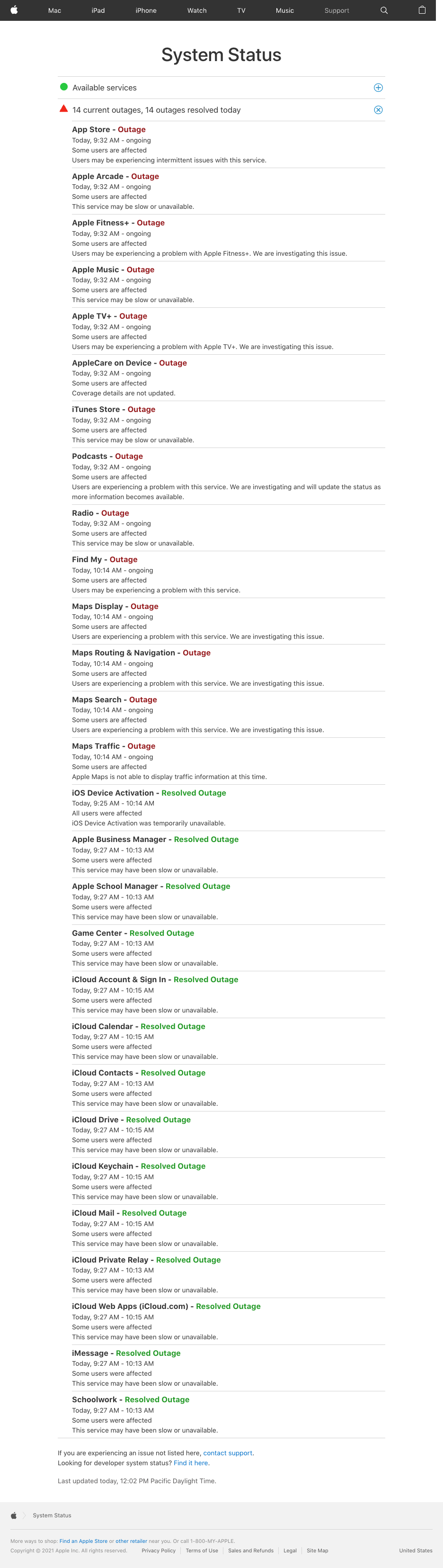Services with confirmed issues, according to Apple’s system status page, included iMessage, some Apple Maps services, iCloud Mail, iCloud Keychain, the App Store, Apple Music, Apple TV Plus, and Podcasts. But after 3:45PM ET or so, every service again has a green light and says the problems have been resolved. Apple has not responded to a request for comment about what might have been going on.