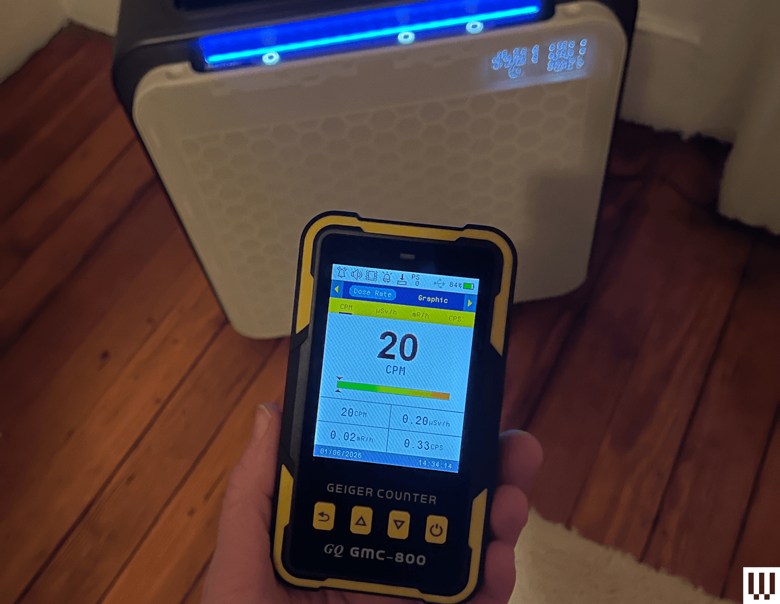 I’m happy to report that Burtran’s claim was correct—its operation did not result in a spike of radioactivity. My entire apartment was measuring around 20 clicks per minute, or CPM—for context, 5-50 CPM is normal background. It’s when the number hits over 2,000 that the GQ GMC Geiger Counter Nuclear Radiation Safety Guide says to evacuate and report it to the government.