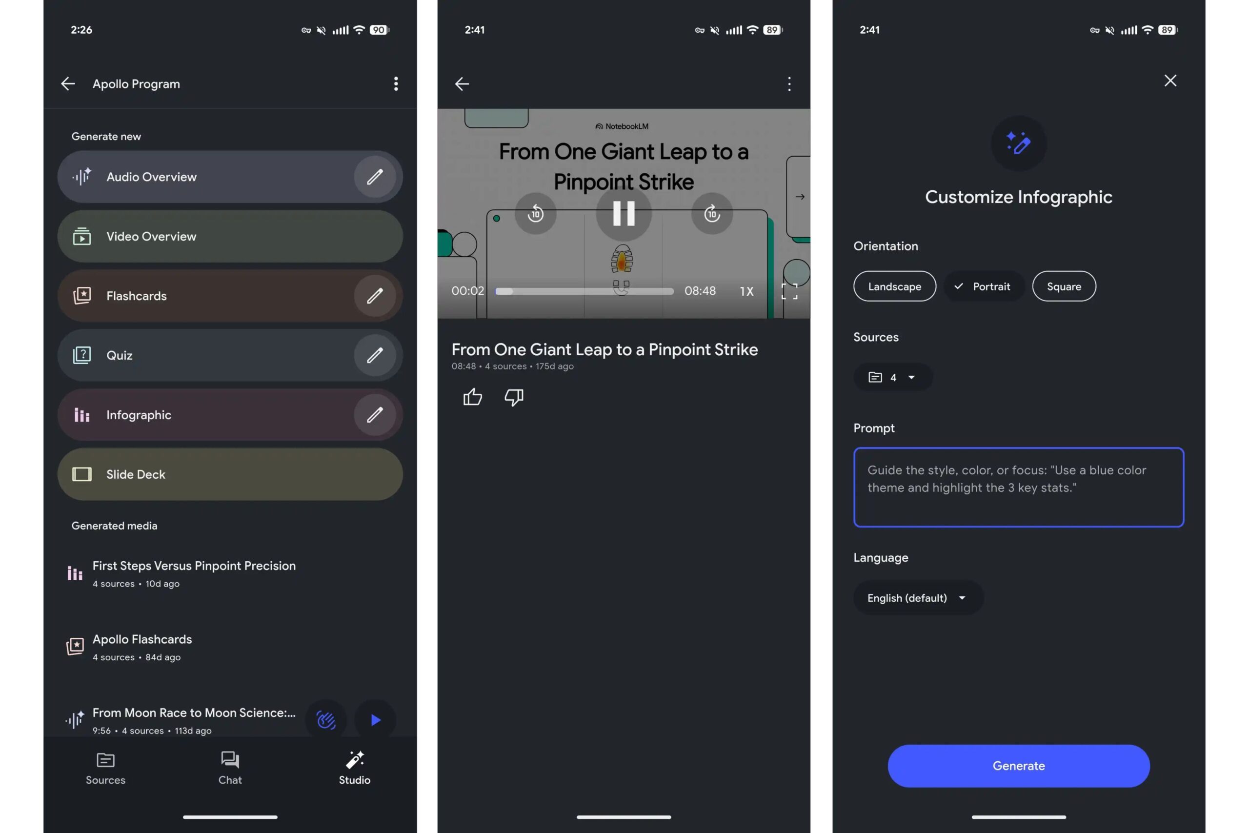 You can choose between Landscape, Portrait, or Square layouts, and decide which sources the AI should use, just like on the web version. You can even set the output language and add a custom prompt before generating the final graphic.