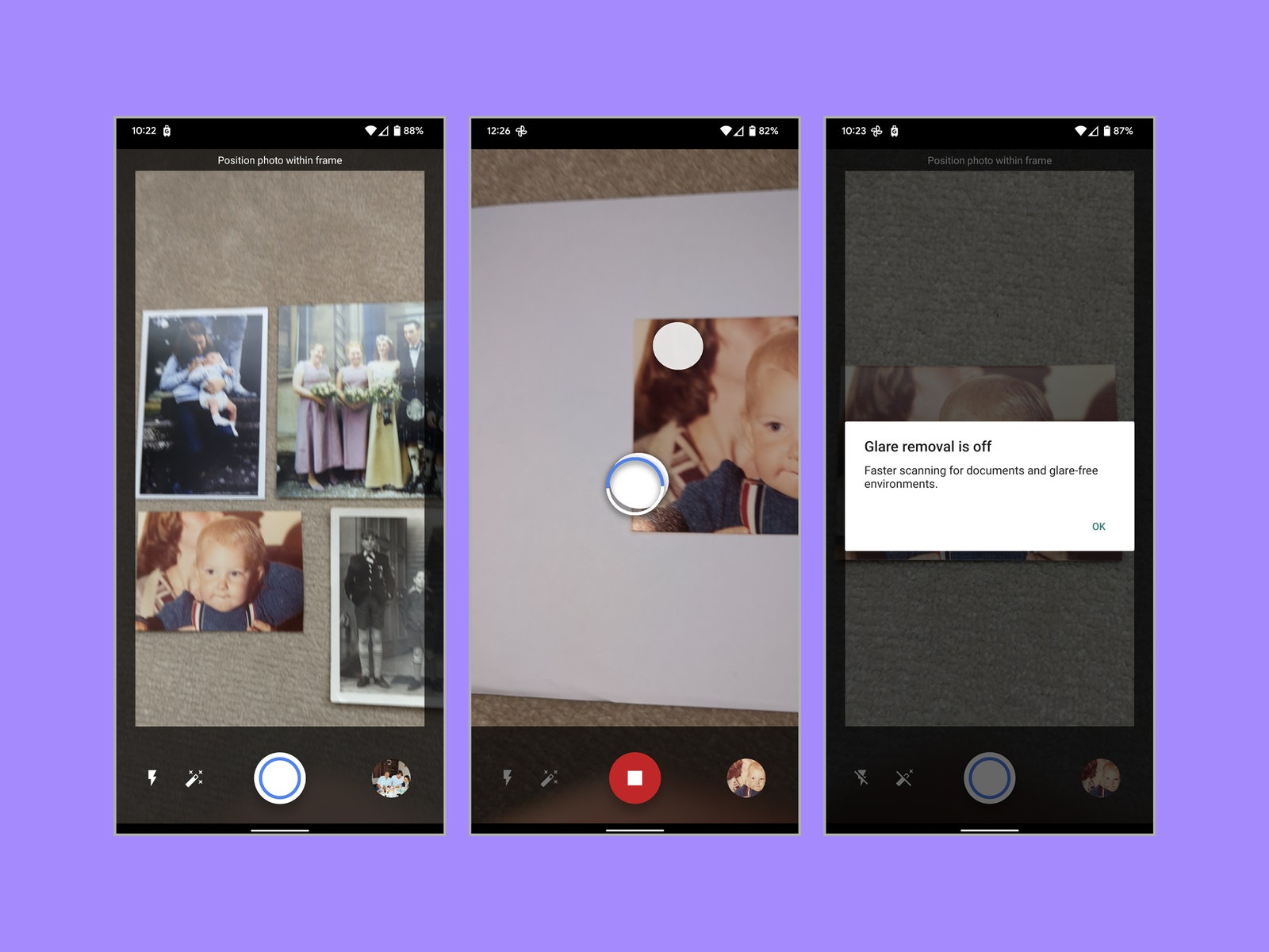 The first app I tested is a natural choice for anyone who uses Google Photos because it automatically backs up scans into your Photos library. The app is free and easy to use, but scanning photos is time-consuming because you must scan them individually. The process requires you to take multiple images, which are then stitched together to produce the best quality picture. When you tap the scan button, you will see four circles (one in each corner), and you hold the phone over each until it fills to capture the photo.