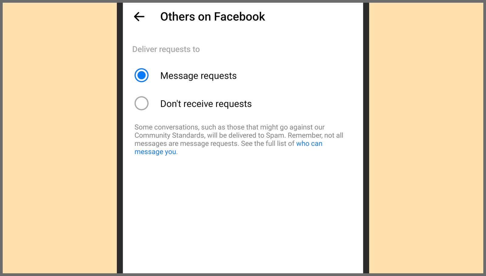 From the mobile Messenger app, tap your profile picture then Privacy and Message delivery to decide whether friends of friends and non-friends on Facebook can send you message requests at all.