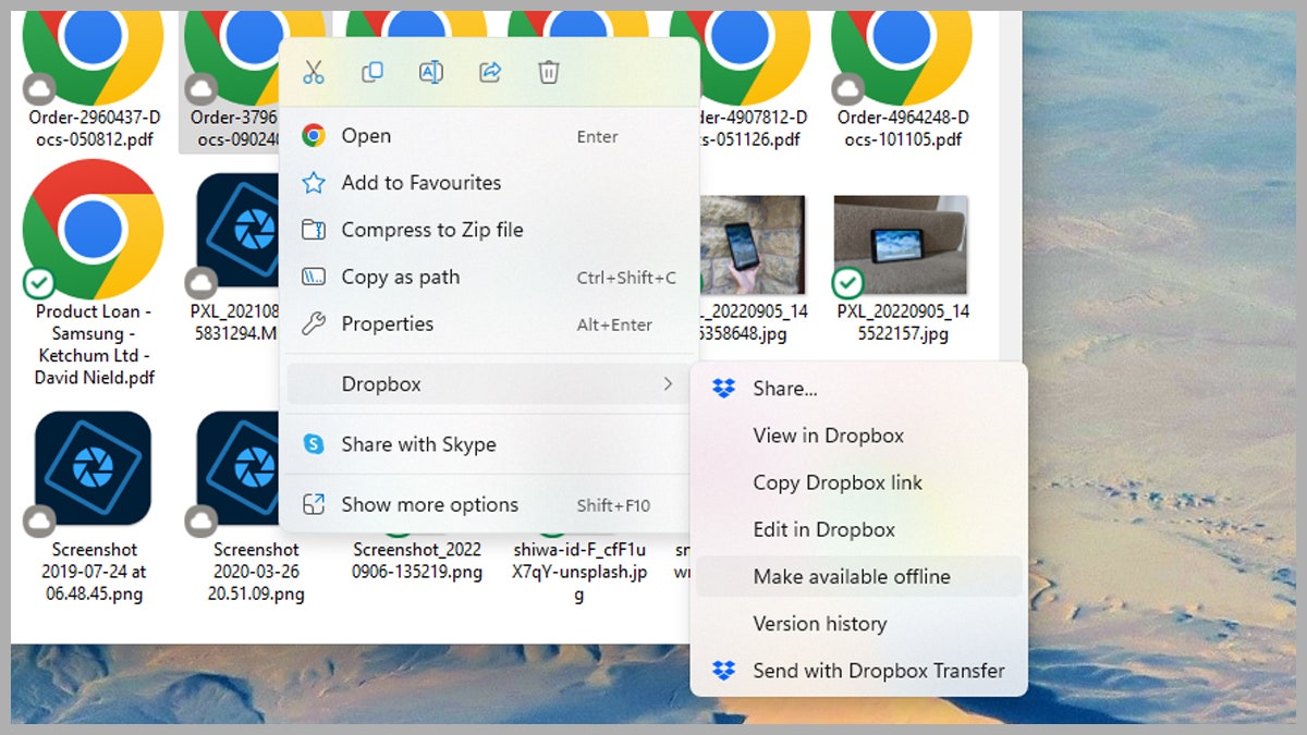 To change this, right-click on a file or folder and pick Show more options, Offline access, and Available offline. As you might expect, to return the file or folder to its default state, you need to right-click on the item again and this time choose Show more options, Offline access, and Online only.