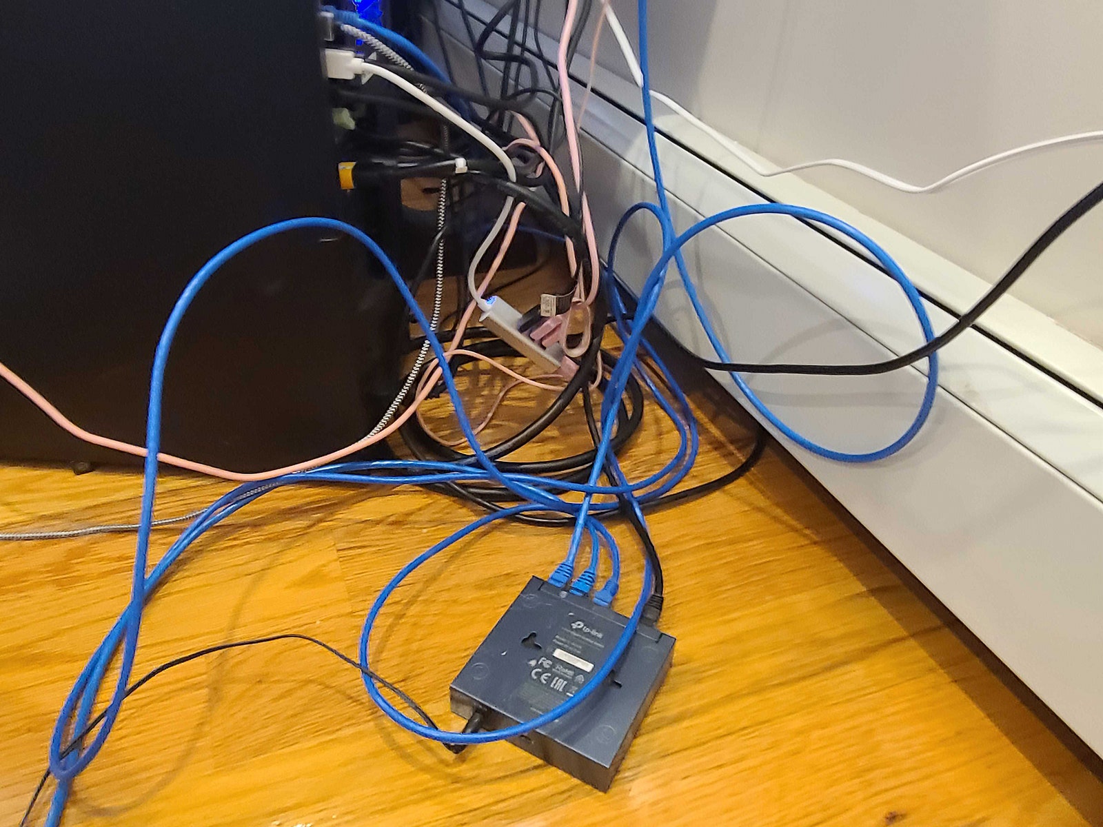 This isn’t to be rude, but you wouldn’t have so many cables to manage in the first place if you’d just purchased the correct length. If you can’t differentiate your floor from your local forest’s, it’s likely because your cables are too long.