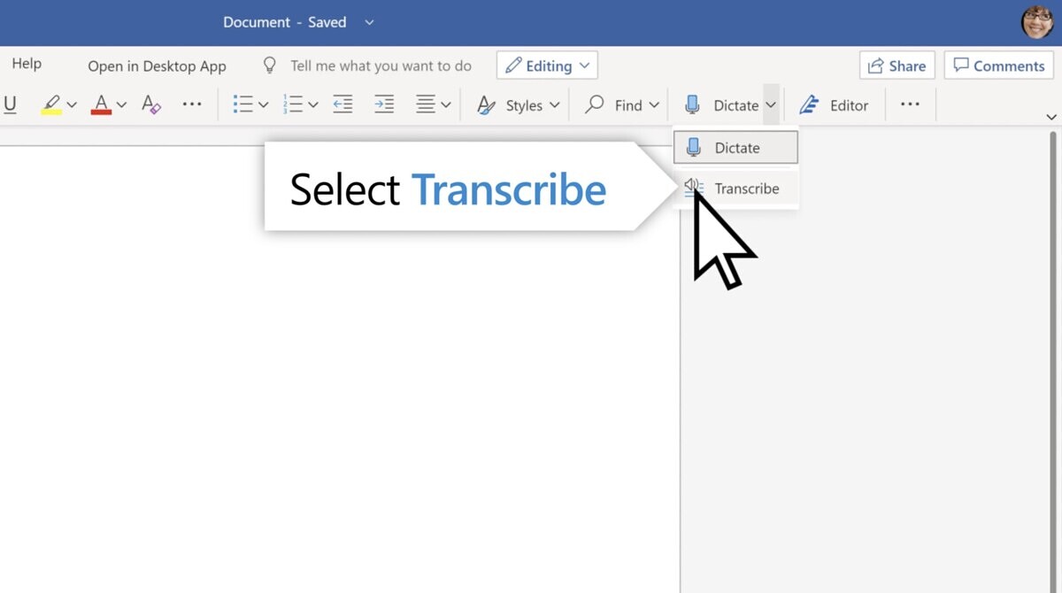 First, you’ll have to go to the online version of Word, which you can access from the Office site. Then open up either a new document or the one you wish to add a transcription to. You’ll see a microphone option in the tool ribbon at the top of the screen, with the word “Dictate” under it. Click the arrow next to it, and the “Transcribe” option should appear in the drop-down menu.