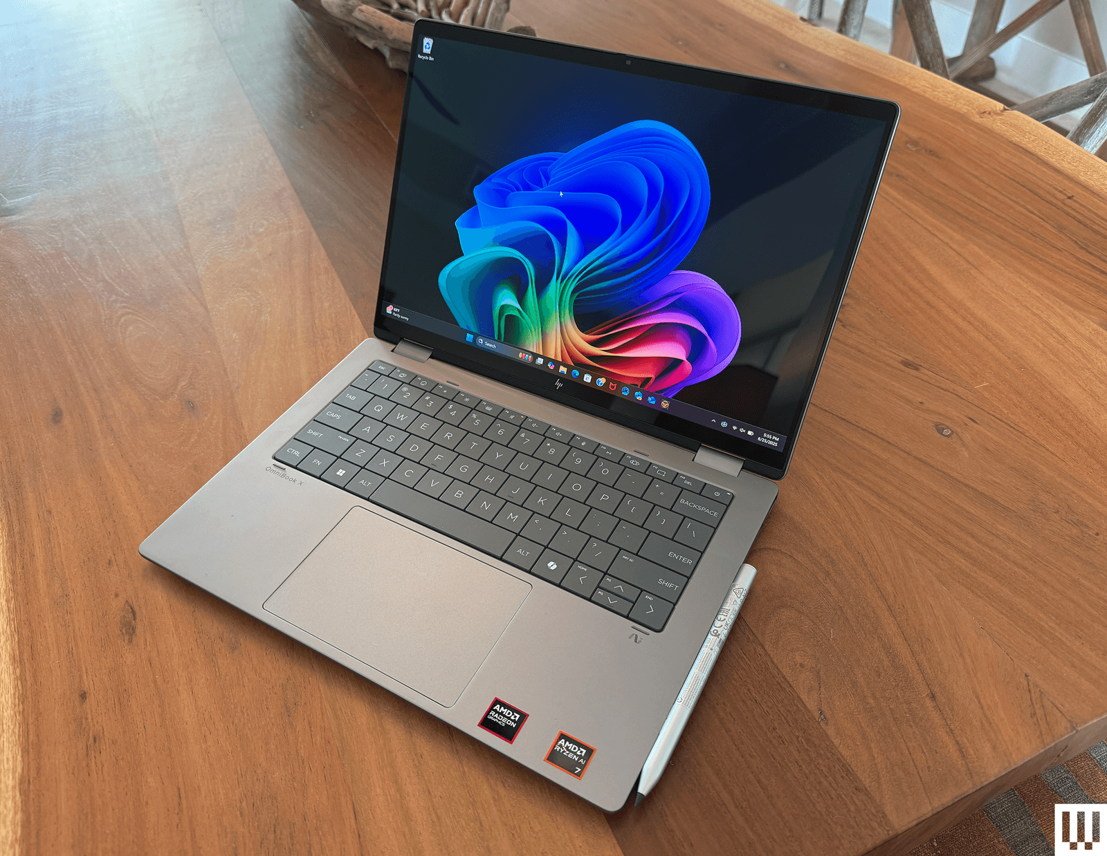 HP swaps Intel for AMD on the 14-inch OmniBook X Flip (though the 16-inch model uses Intel CPUs), and the model reviewed is one of the higher-end configurations available, including an AMD Ryzen AI 7 350 CPU with AMD Radeon 860M graphics, 32 GB of RAM, and a 1-terabyte SSD.