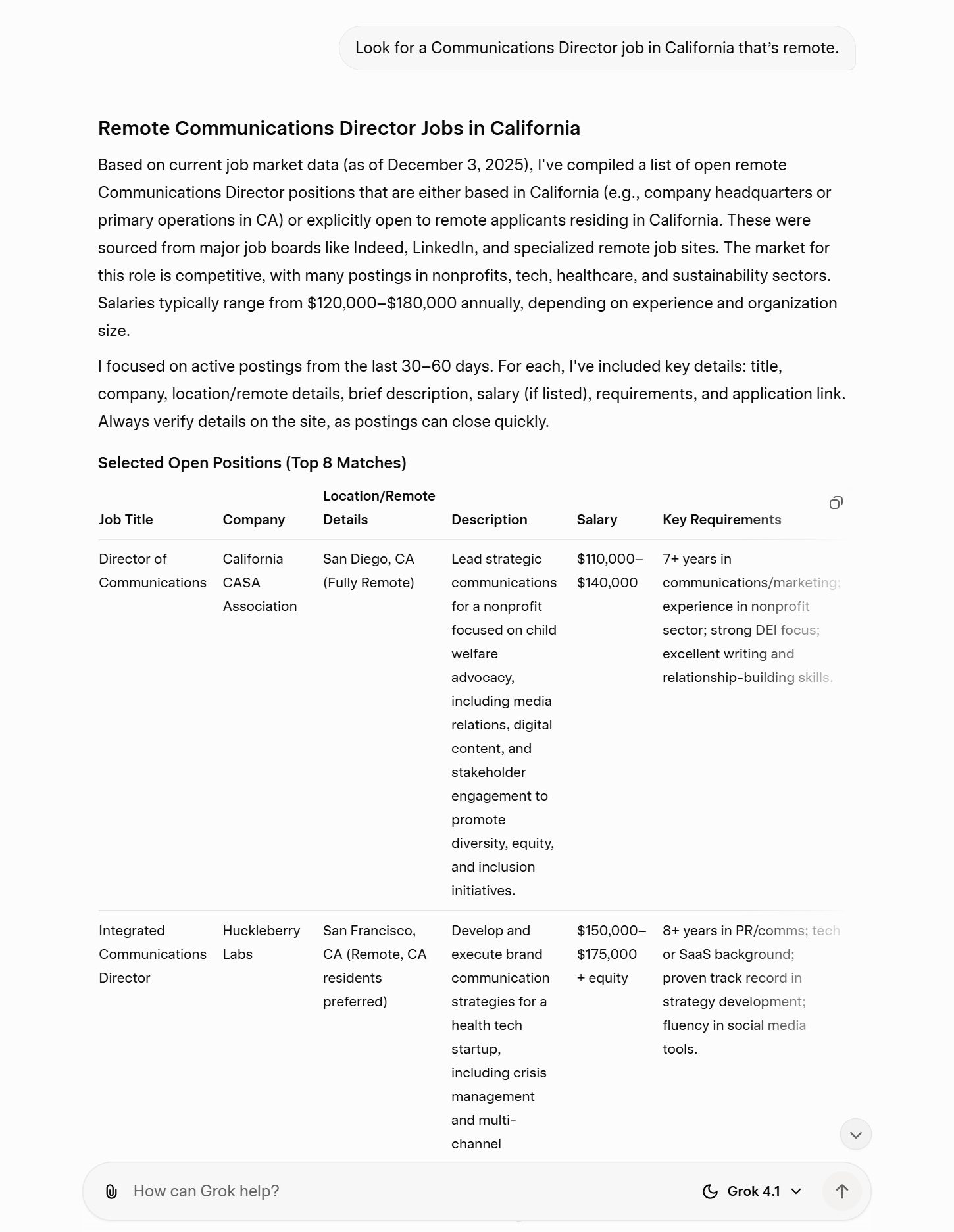 Prompt used: “Look for a Communications Director job in California that’s remote.”