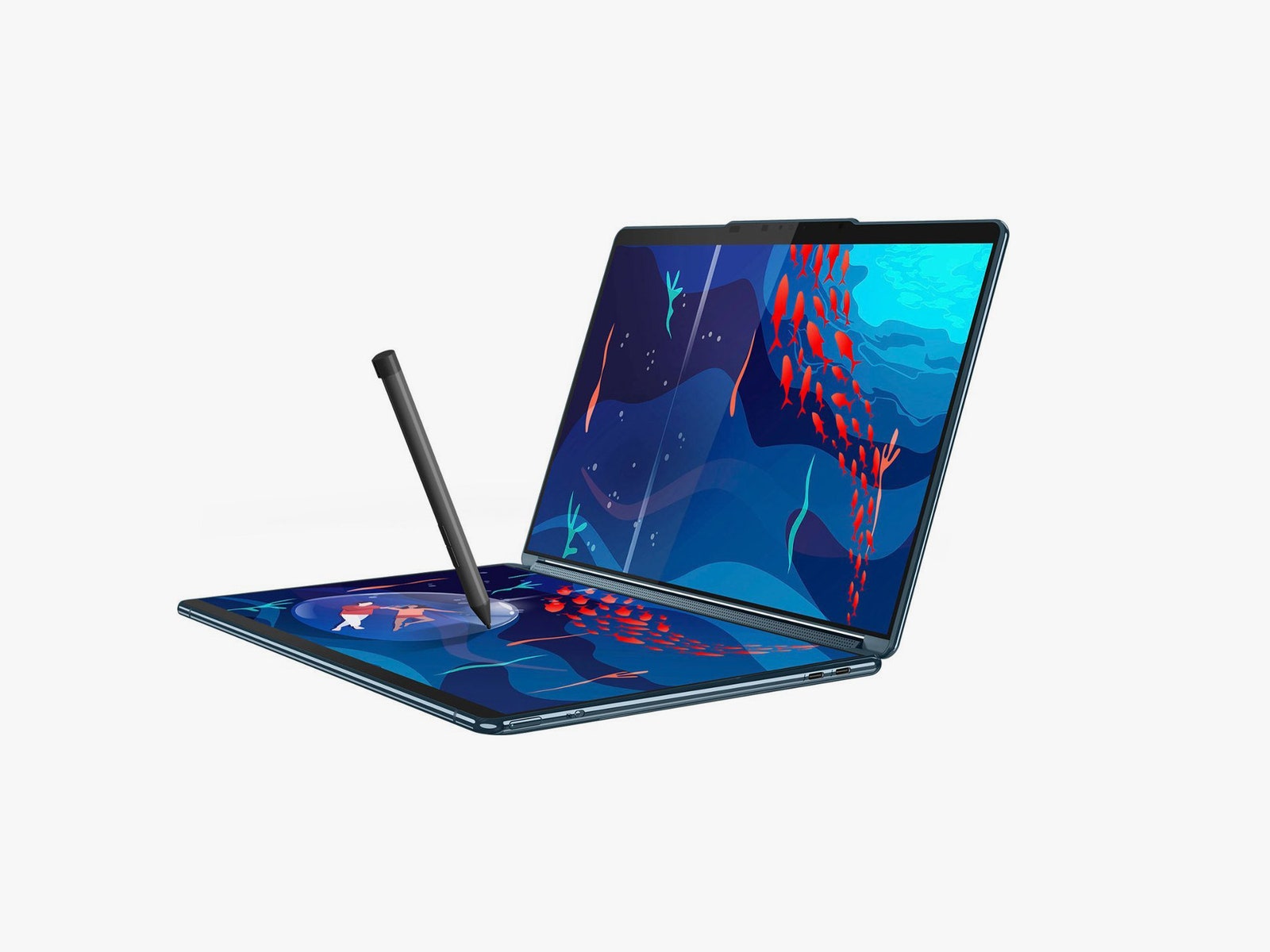With the Yoga Book 9i, “second screen” means a full screen. There’s no keyboard here at all; the lower half of the laptop is a touchscreen identical to the upper half. Take two 13.3-inch OLED displays and sandwich them together with a hinge in between and you’ve got the idea.