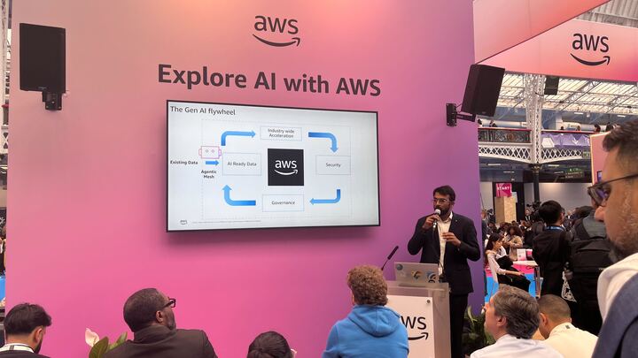 Next, it’s AWS – who very kindly give me a demonstration of their Checkbot agentic AI. In the demonstration, the chatbot is asked to create a newsletter using trusted sources, and is given prompts to tweak the output. It did manage to produce a newsletter, albeit a simple one. I also took a look at a demonstration of the “GenAI Flywheel” – which puts AWS at the centre of data, security, and governance.