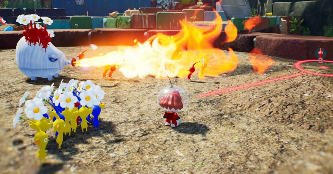 For the next hour, this is how I spend most of my time with Pikmin 4, Nintendo’s playful real-time-strategy series in which a plucky little captain commands mobs of plantlike aliens. The game’s eponymous creatures each have special skills, signified by their color. Red are the most plentiful (see: basic) and typically do well against fire, for example; yellow can be tossed higher, and so on. Pikmin are hardy companions who will dutifully harvest and carry resources.