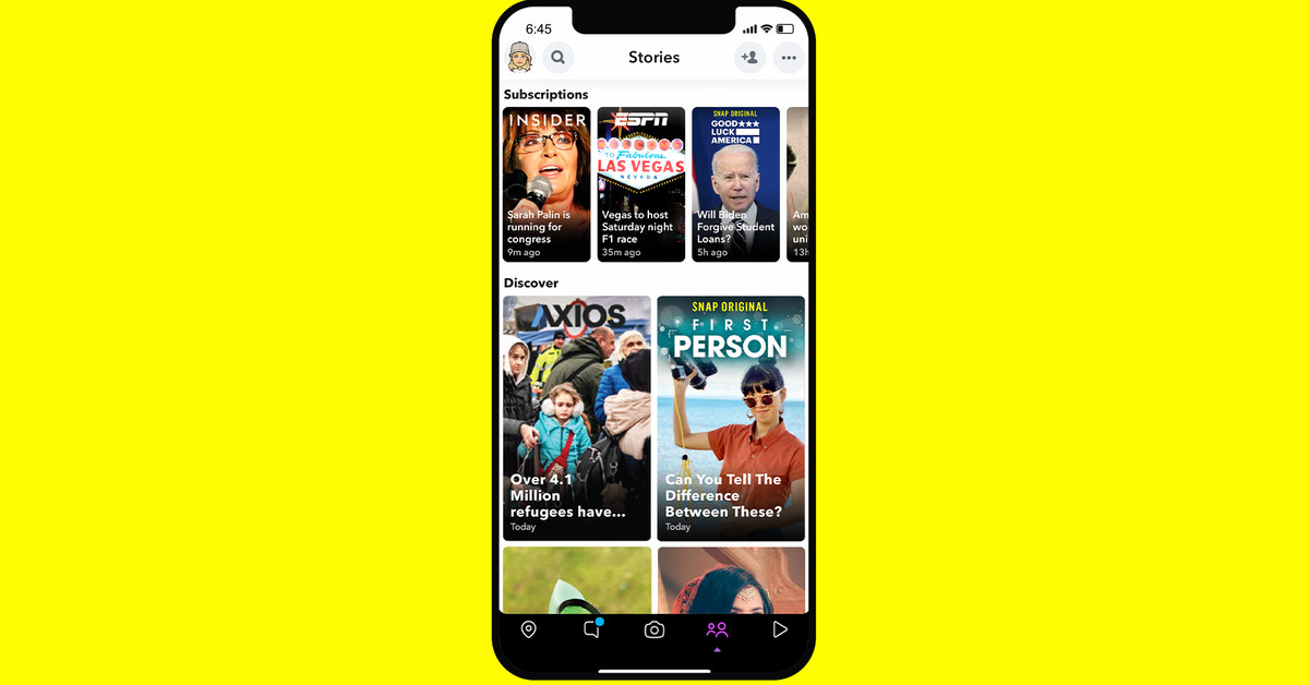 Dynamic Stories from publishers appear on a Snapchat user’s Discover feed and update in real time as news breaks. Users can tap on a publisher’s Stories, read a headline, and swipe up to read the full story. Only verified publishers and creators appear on the Discover tab, Snap says.