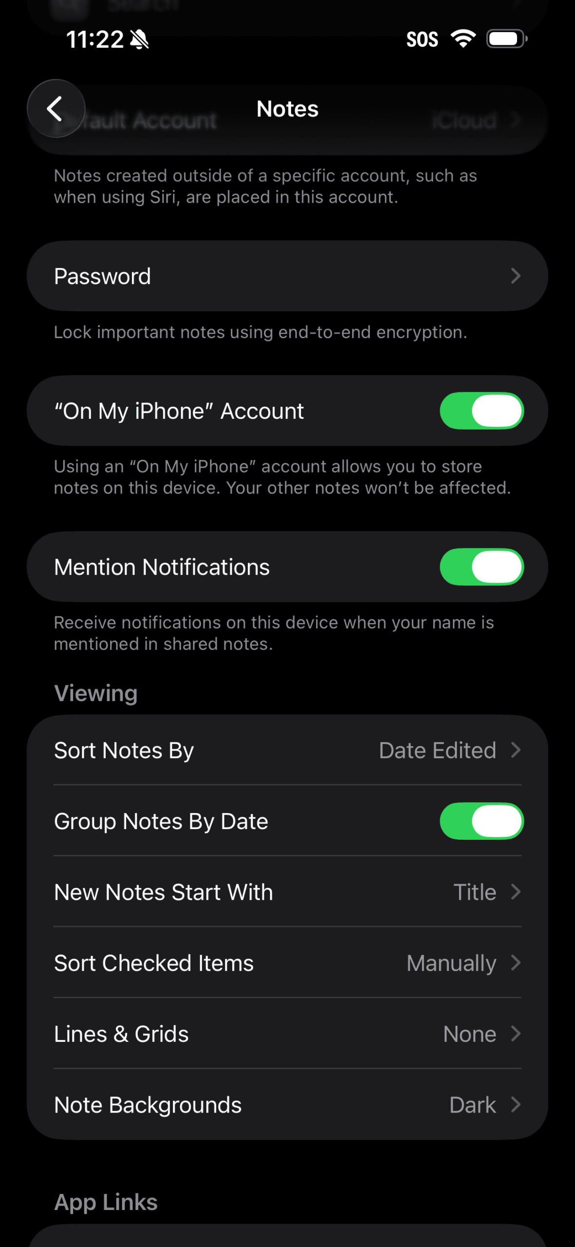 To set it up, open Settings and go down to the bottom of the list for Apps. Find the Notes app and toggle the On My iPhone Account setting on. Just above it, you can also set a password if you want to encrypt and lock any highly sensitive notes. Remember, you won’t be able to pull up these notes on another Apple device because they won’t sync, and if you lose your iPhone, you may not be able to access your notes altogether without a recent backup.