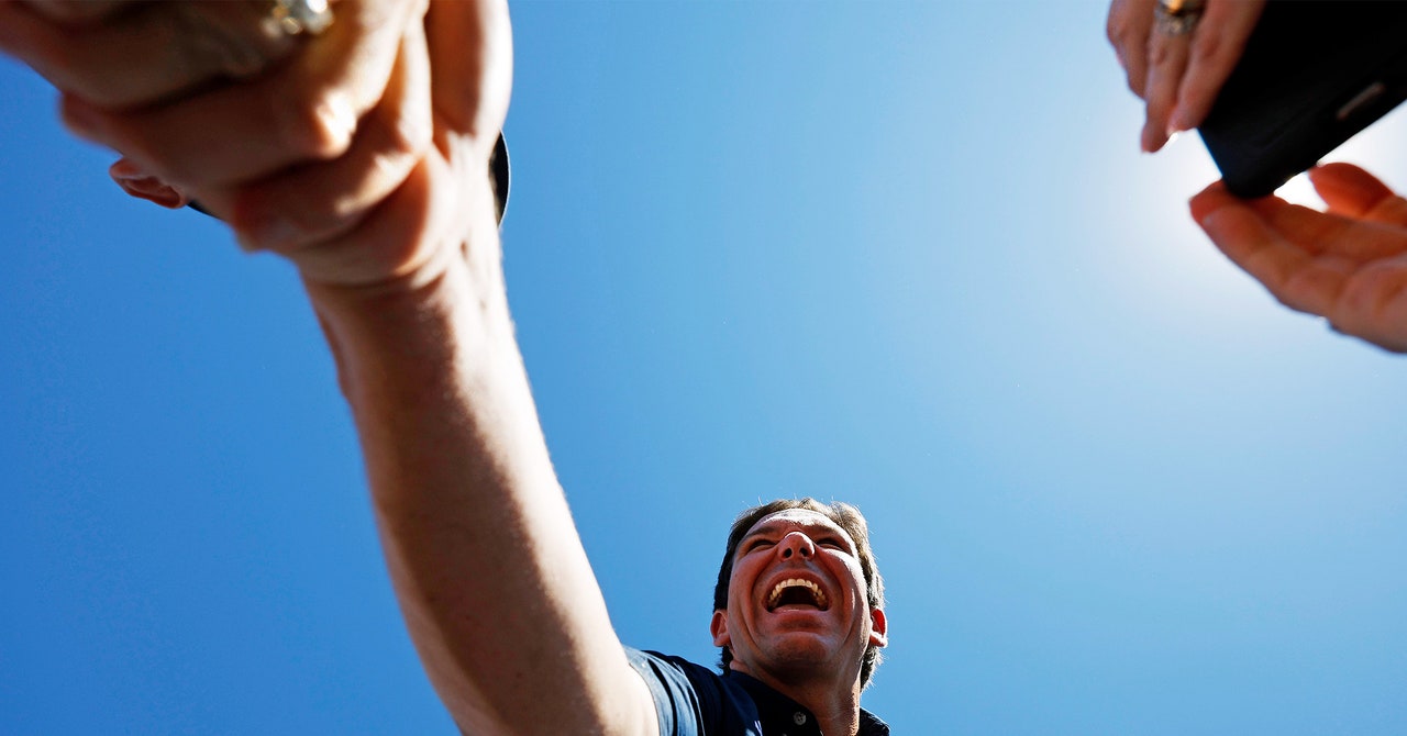 In an image of DeSantis at the Iowa State Fair, taken by photographer Chip Somodevilla, we see the Florida governor as he sees himself but not for who he really is: towering and altruistic, a true-blue advocate for everyday Americans. The angle of the camera’s eye suggests another truth, one closer to the panorama of our lived reality. DeSantis is made big only by making others small. With his right hand extended and his wide Chesire smile reminiscent of a 1990s Aphex Twin album cover, the camera points upward, giving DeSantis the impression of gross idolatry. I can’t escape the thought: He’s standing tall but only at the expense of whole communities he steps on, people who are made into targets because of his dangerous beliefs and rigid policies.