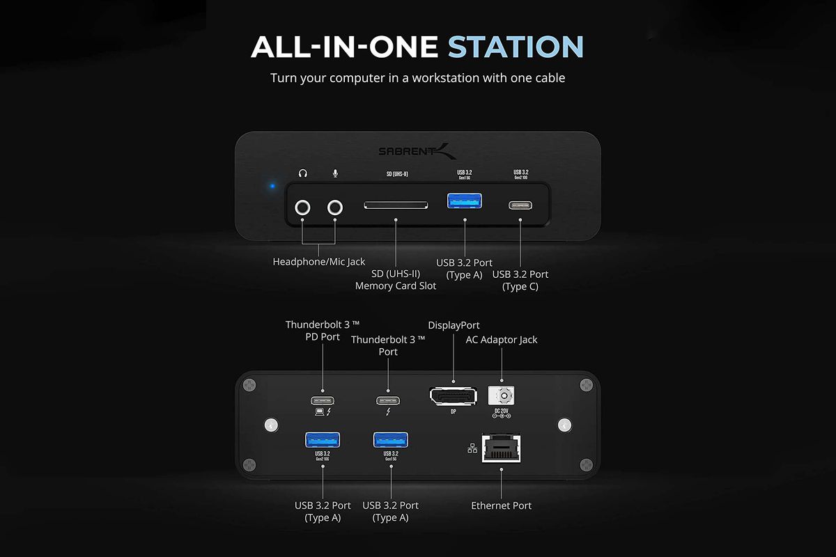 But the rest of Sabrent’s dock’s specs are respectable. There are a pair of Thunderbolt 3 ports on its rear, and it can provide up to 96W of power to an attached laptop. You also get Gigabit Ethernet, DisplayPort 1.4, and two USB Type-A ports on its rear. Around front, there’s a pair of 3.5mm jacks for headphones and mics, an SD card slot (with UHS-II speeds for you port nerds out there), a Type-C USB port, and a third Type-A port.