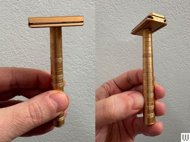 The razor’s head is two parts that dovetail together and are then compressed using the screw-on handle. The handle holds the blade in place with extreme rigidity at a precise angle so the blade doesn’t chatter around, which can cause skin irritation. The blade barely sticks out from the head, with an edge only about half the width of a hair exposed—you’ll have to look very closely to see it.