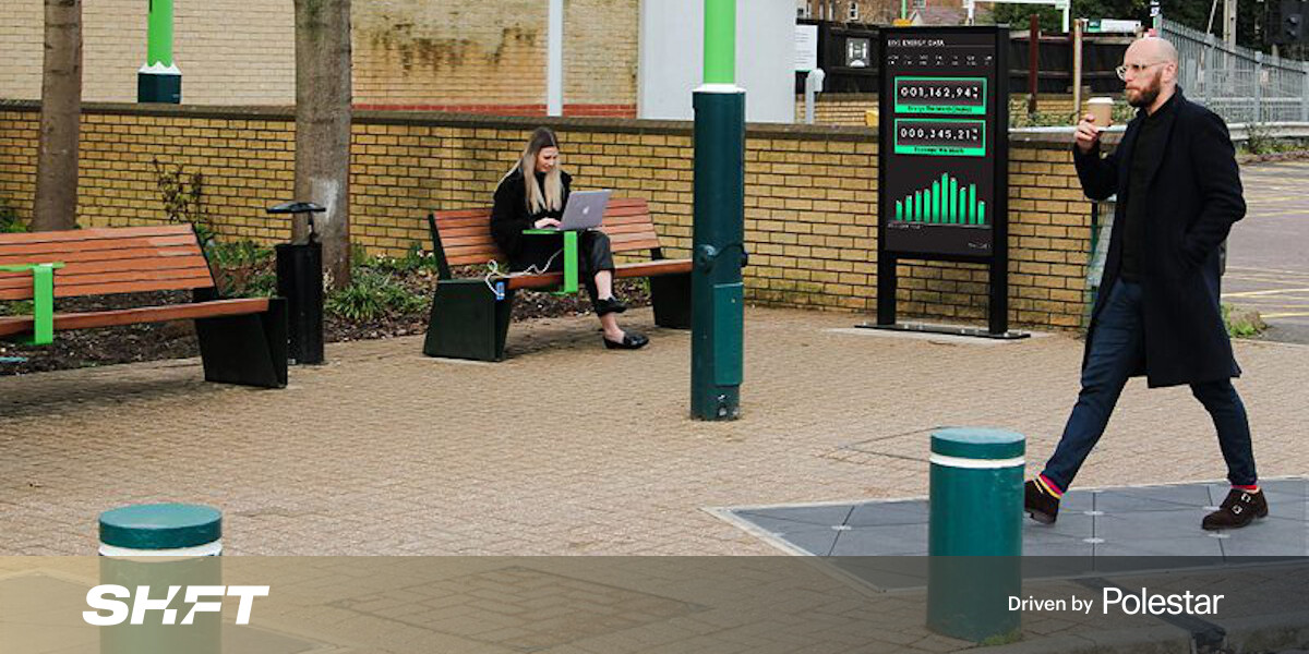 As pedestrians walk across the paving system supplied by the UK start-up, the weight from their footsteps compresses electromagnetic generators below, producing electricity which will be used to power two USB-charging benches as well as a digital screen.