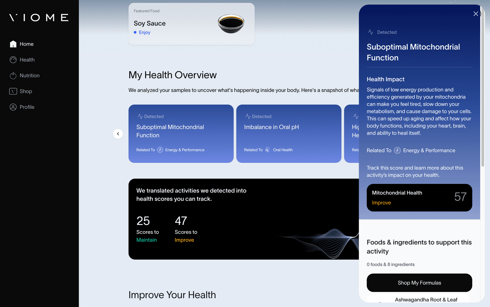 I can also click those to get a one-paragraph explainer of each. At this point, I was three layers deep, but Viome does not tell you in the app what it’s actually testing. We reached out to Viome, and Grant Antoine, a naturopathic doctor and the nutrition and clinical lead at Viome, responded that Viome uses RNA sequencing to decode the gene activity of mitochondrial proteins; the company does have its own research facility with its own proprietary sequencing methods. Antoine also pointed out that the raw data from RNA sequencing isn’t interpretable or useful without Viome’s AI-enabled bioinformatic analysis.