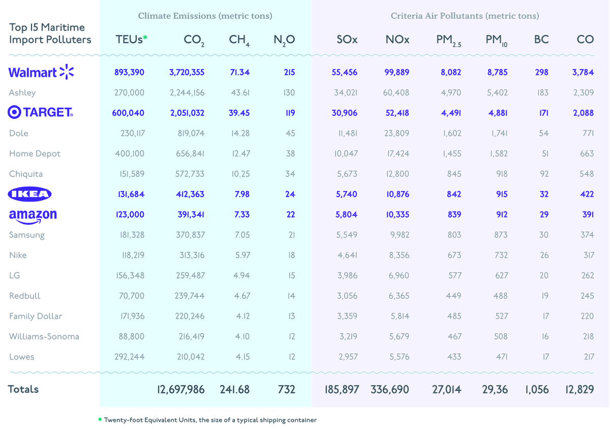 The report looks at greenhouse gas emissions and air pollution caused by shipping piles of cargo around the world and ranks the top 15 biggest polluters by company. Walmart tops the list, generating more greenhouse gas emissions than a coal-fired power plant would in a year. Ashley Furniture, Target, Dole, and Home Depot round out the top five. Ikea and Amazon ranked 7 and 8, respectively. Samsung ranked 9th, and LG was 11th.
