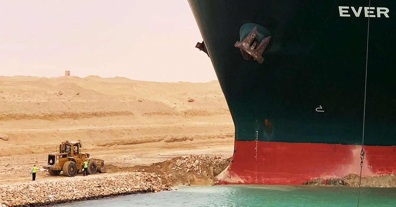 Ever since Tuesday, the Ever Given—a four-football-fields-long container ship traveling from China to the Netherlands—has been jammed in the Suez Canal. Packed with 200,000 tons of tracksuits and ginger (and other stuff), it got stuck sideways, and crews have been trying to get it unstuck ever since. It could take days or weeks, and it’s blocking other ships with millions of dollars worth of cargo that now can’t pass through the waterway between the Mediterranean and the Red Sea. If you want a more intelligent explanation of what’s going on here, please do read my colleague Aarian Marshall’s excellent explainer, but in short, it’s a mess.