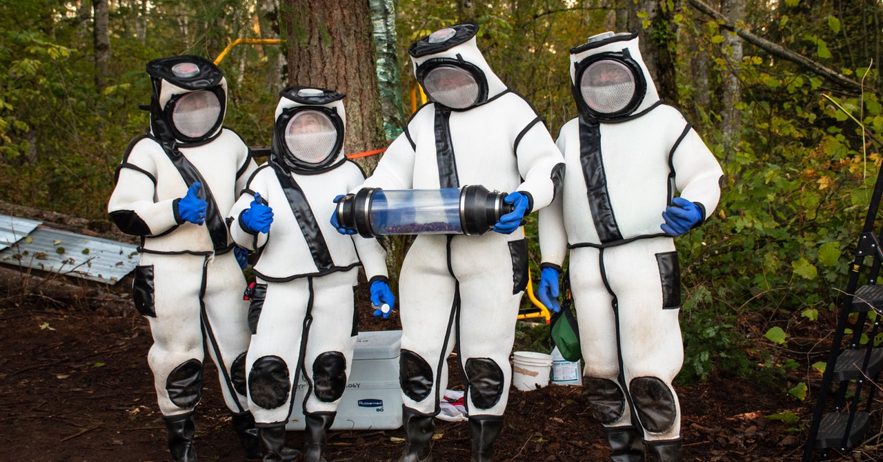 That’s one of the reasons WSDA wanted to move so quickly—there were worries the insects might be getting close to people. So it was a good thing they had the suits already on hand. But they hadn’t expected to encounter a nest in a tree, so they needed a few days to get a new plan together. Around 5:30 on Saturday morning, more than a dozen WSDA workers gathered in the property owner’s yard, helping each other into the suits by the red light of their headlamps. (White lights tend to agitate the hornets.) Looney and others had set up scaffolding around the base of the tree earlier in the week, and now his colleagues stood atop it as they crammed dense foam padding into a crevice above and below the nest entrance. Then they wrapped the tree with cellophane, leaving just a small opening. Looney inserted a Shop Vac hose, sucking the insects out of their nest and into a secure container.